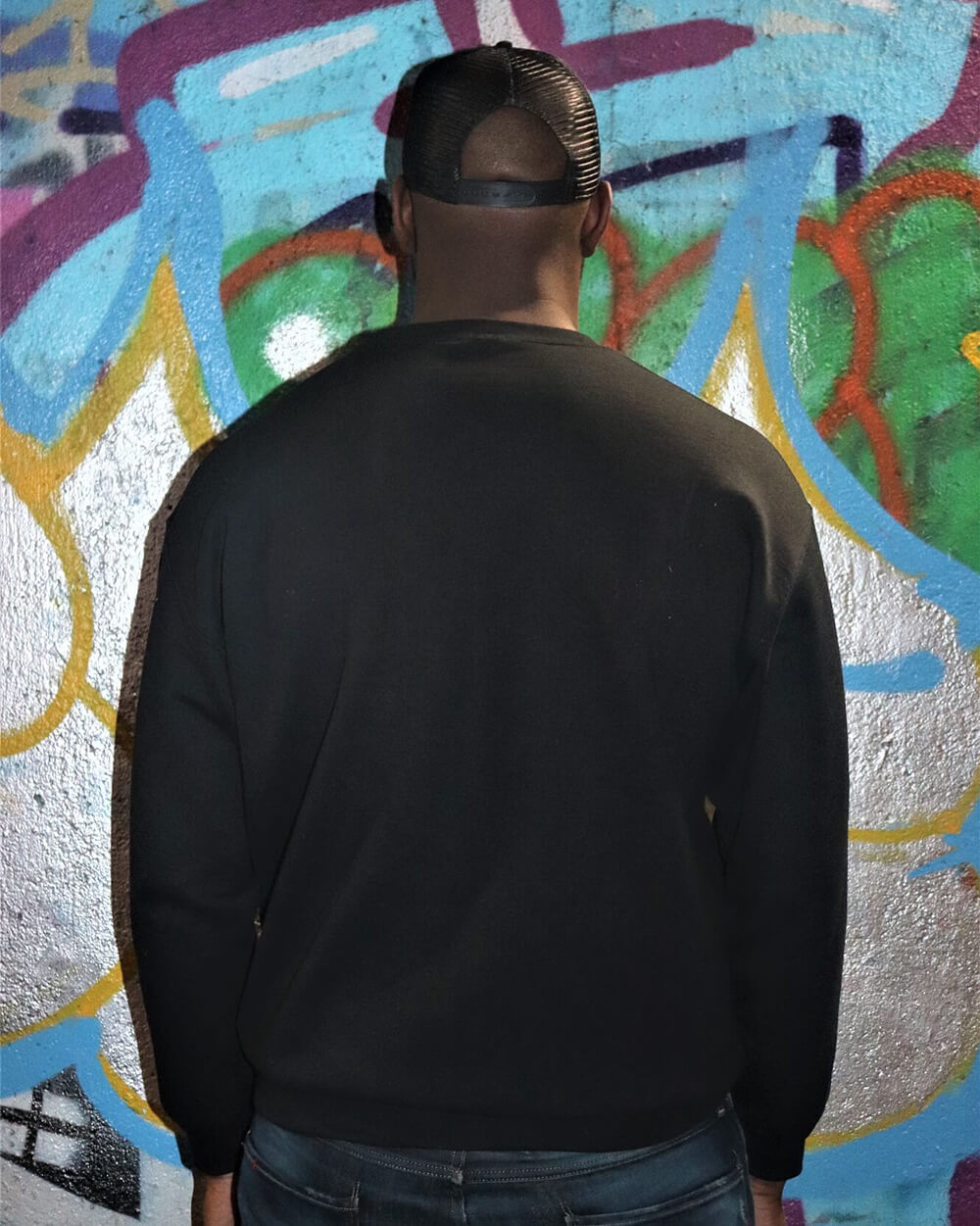 Men’s black jumper with white embroidery, crew neck and long sleeves.